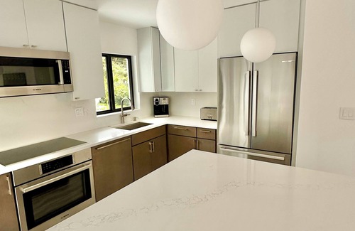 The kitchen is a chef oriented, with Bosch appliances including a 30” induction cooktop with overhead convection microwave, built in oven with convection and air fry capabilities, and a large 36” French Door refrigerator. Large drawers hold cookware set and two frying pans, non-stick bakeware, flatware, plates and any tool one could use to cook or bake. A dual function K Cup and pot brew machine along with a N’Espresso machine caters to the coffee selection of your choice. A deep sink and expansive counter space and island provide ample prep space with seating for three to keep you company.