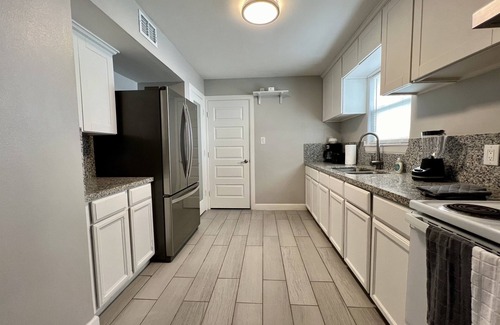 This home, conveniently located in northeast Brownsville, is just minutes from the Brownsville Airport and has quick access to South Padre Island, the SpaceX Launch Facility, and the Port of Brownsville. This newly remodeled home features modern finishes in all areas and a fully equipped kitchen stocked with all your basic cooking essentials. There are smart TVs in all (3) bedrooms with complimentary WiFi throughout the home. Each bedroom has comfortable beds and AC units for a cozy nights sleep. The home has a washer and dryer located downstairs to save you a trip to the laundromat!