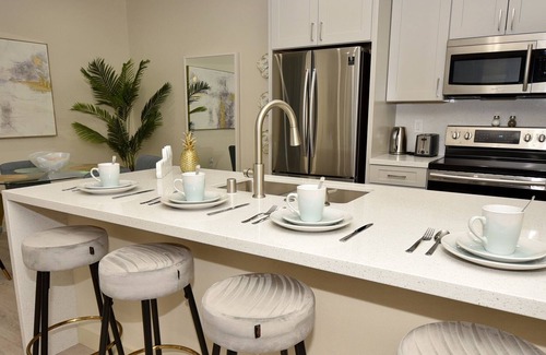 Modern 1 Bedroom 1 Bathroom unit. This unique place has a style all its own. Completely remodeled laminate floors, quartz countertops, private balcony, full-size Washer and Dryer, and remodeled showers. This unit has it all: a full kitchen equipped with a range, dishwasher, full-size refrigerator, microwave, Coffee maker, toaster, Cookware, and service for four dinnerware. All linens and bath towels are provided. WiFi available, Hairdryer, Ironing board with iron. It is located in a gated community!