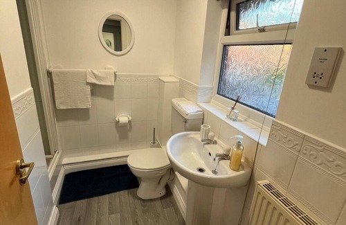 Welcome to this cozy 2-bedroom flat in a gated community, ideal for up to 3 guests. The master bedroom features a king-size bed with a sleek en-suite bath, while the second bedroom offers a single bed and quirky en-suite shower. The spacious living room includes a 43” Smart TV and Juliette balcony overlooking a bowling green. Enjoy cooking in the fully equipped kitchen. With added security and a peaceful setting, it’s perfect for a relaxing stay near local amenities.