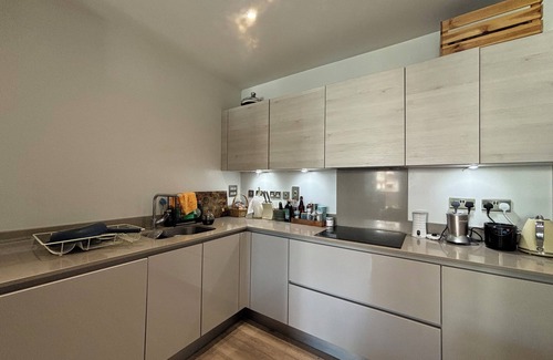 This beautiful and open kitchen is ideal, with modern inbuilt appliances, sleek cupboards, and ample counter space make this a culinary hotspot for any home chef. The wood-effect flooring and sleek grey cabinets give the space a minimalist, stylish feel, adding to the overall modern aesthetic of the flat. This really is a home cooks haven! Within the space is also a large wooden dining table that seats six, perfect for family meals or entertaining guests.