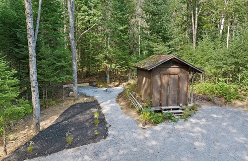 Upstairs, a loft-style sitting area invites you to relax, with a balcony that overlooks the lush backyard. The scene is framed by young ferns and tall pines, all kept company by a wood-fired soak tub—ideal for a peaceful retreat. Beyond that, you'll find two inviting bedrooms. One has a plush king-sized bed and generous closet space, while the other boasts a striking A-frame window, offering a beautiful view of the land below. Lie on the handmade platform bed beneath a sky full of stars.