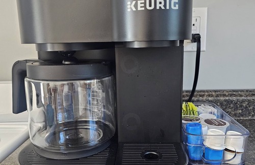 Enjoy the convenience of a fully stocked kitchen, featuring a stove/oven, refrigerator, cookware, dishware, glassware, utensils, a lobster pot, and a combo Keurig/drip coffee maker. (Please note: guests provide their own meals.)