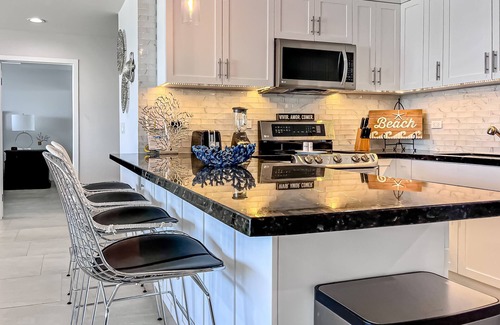 -Fully Equipped Kitchen: High-end stainless steel appliances, granite countertops, ample storage, a breakfast bar, and an indoor dining table for eight. Outdoor dining for five on the balcony.