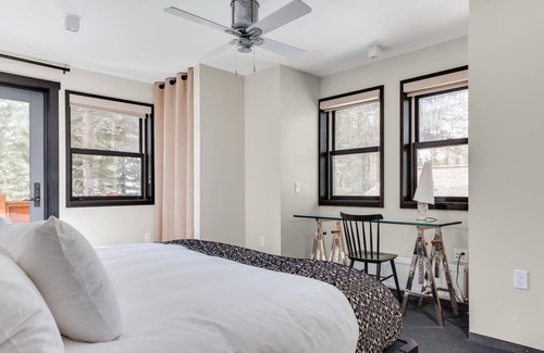 In the living room, a mid-century sectional sofa faces a chic, steel firebox and large-screen TV, accented by an industrial coffee table. Through a grand entryway, the living area flows into an eat-in kitchen, where a family-style dining table seats up to 8 guests. Fully equipped with stainless steel appliances and a wet bar, the kitchen offers plenty of room for crafting hot cocoa and cocktails after a day on the slopes, or baking a batch of cookies on a snowed-in afternoon.