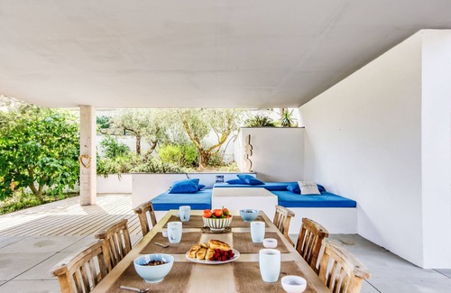 Cova d'Aiguablava 2 km from Tamariu: Very modern, luxurious villa "Modern Chill". In a quiet, sunny, elevated position residential area (villas), 1 km from the sea, 1 km from the beach. Private: natural garden (fenced), swimming pool angular (10 x 4 m, depth 120 - 180 cm, seasonal availability: 01.Jan. - 31.Dec.). Outdoor shower, patio, pergola, garden furniture, parking at the house. Supermarket 2 km, restaurant 1 km, bus stop "Residencial Begur" 3.5 km, railway station "Flaça" 33 km, sandy beach "Aiguablava" 1 km. Sports harbour 7 km, golf course (36 hole) 15 km, tennis 9 km, riding stable 9 km. Nearby attractions: Far de Sant Sebastià 6 km, Castell de Begur - Centro Historico 7 km, Pals - Pueblo Medieval 11 km, Jardíns de Cap Roig 12 km, Peratallada - Pueblo Medieval 19 km, Illes Medes 28 km.