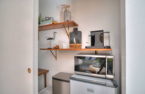 Fully equipped kitchenette (kettle/mini fridge/microwave) with cups & glasses