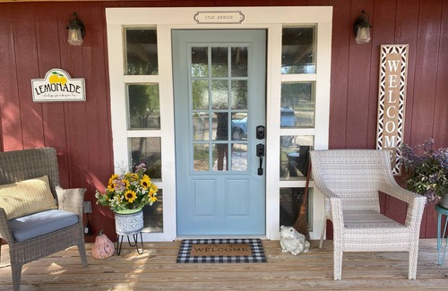 Welcome to Stay Awhile, your vacation rental just a mile from historic downtown Bandera! Home to the 11th Street Cowboy Bar, shops, restaurants, museums and much more. Our cottage has two bedrooms, a pull-out couch, and one full bathroom. It features high vaulted ceilings, a cozy living room, a kitchenette, high-speed internet, a designated workspace, a private secure fenced in yard, a propane grill, and private parking. The covered front porch is a great place to enjoy early morning coffee or evening drinks with friends. If you're looking for an amazing getaway, this Hill Country cottage is the perfect place for you!