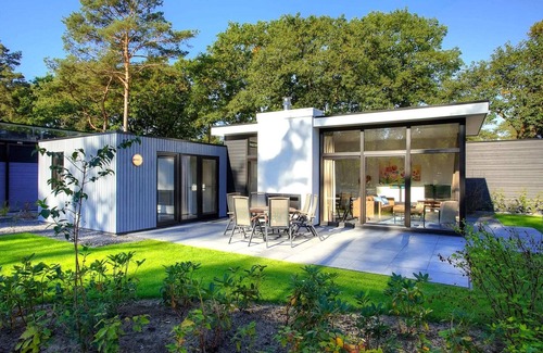 This modern, detached, single-storey holiday home is located in the spacious holiday park Resort Bad Hulckesteijn, located on the Veluwemeer at approx. 4.5 km from the town of Nijkerk. This holiday home is furnished in a modern and comfortable way. Due to the raised ceilings (about 3 meters high) and the large windows, the spacious living room is wonderfully light. The large sliding doors make it easy to bring the outdoors inside. The living room features a TV. The kitchen includes a dishwasher and a microwave. There are three bedrooms, two of them with each two single beds. box-spring beds, whether or not in a 2-pers. setup, and one with a bunkbed. The bathroom is equipped with a shower and there's a separate toilet. Through the patio doors, you can reach the terrace with garden furniture. There's parking for one car at the holiday home. At holiday park Resort Bad Hulckesteijn, various chalets and holiday homes can be booked for two to eighteen people.
