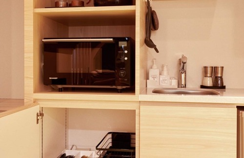 The elevator hotel has five independent suites with one suite per floor offering guests privacy Each suite is elegantly furnished with a work area suitable for small families or business travelers The hotel also offers a laundry room / This guest room is located on the 5th floor the only guest room on this floor The living room is a tatami area with a Japanesestyle coffee table and chairs and two Japanesestyle mattresses can be laid on top of the tatami for nighttime sleep after changing the placement of the coffee table and chairs The kitchenette has a Nespresso coffee machine and all the necessary equipment and facilities for living The whole space is comfortable quiet and unique