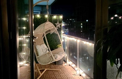 Guests staying at this apartment have access to a balcony with seating and a patio heater. The apartment features 1 bedroom, 1 office, 1 full bathroom with a shower, laundry, full kitchen, dining, and a spacious living room.