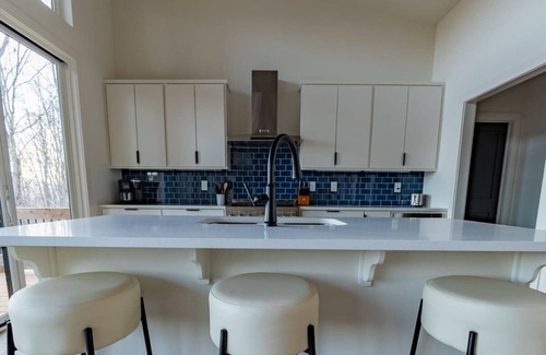 This brand-new mountain masterpiece offers a modern kitchen that’s bright and inviting, making it the perfect spot for cooking your favorite meals. Equipped with stainless steel appliances and gadgets, including a blender and Keurig, you’ll have everything you need to broil, fry, and bake in style. Enjoy your culinary efforts at the large dining table, or step outside to enjoy dinner with a view on the large deck.