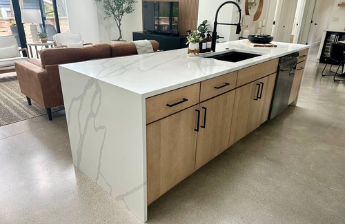 Adjacent to the living area, the kitchen is a chef's dream, complete with sleek quartz countertops, state-of-the-art appliances, and all the essentials you need to prepare delicious meals. Enjoy your morning coffee at the spacious island or gather around the dining table for a family meal. Complimentary coffee, tea, cream, sugar, hot cocoa, and apple cider are provided at our coffee bar to enhance your stay, along with a temperature-controlled wine refrigerator. Whether you're a culinary enthusiast or simply want to enjoy a morning cup of tea, this kitchen has everything you need.