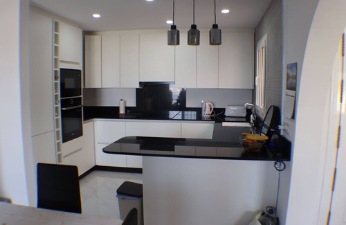 The large private pool (protected by a child-proof fence) overlooks the sea and leads onto a terrace that provides the most spectacular views in Mojacar - in an arc of about 210 degrees the Mediterranean fills around 90 degrees, the town another 90 degrees and the mountains the remainder; Garucha and more can be seen in the distance. There is a large range of sunbeds, sofas and tables as well as a BBQ for al fresco dining. The house has another terrace and a balcony. The dining room leads out onto a terrace. The house has air-conditioning / heating throughout. Three of the bedrooms are doubles with en-suite facilities, and lead either directly onto the veranda or onto a balcony. The 4th bedroom has bunk beds, a single bed and a cot with a WC and basin in the adjacent room. Please note: All the bedrooms have black-out curtains installed