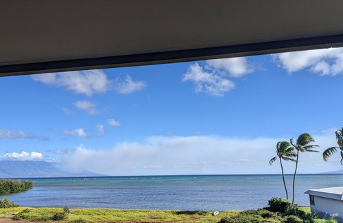 This two-bedroom two bath condo is an oceanfront end unit which boasts two lanai's! Nothing but blue sky and ocean! Fabulous views of Maui and Lanai as well! The kitchen, floors and baths have all been nicely upgraded. The master bedroom has a spacious king bed, and the second bedroom has a queen bed. There is a pull-out sofa bed in the living area and a futon on one lanai which can sleep two more! Lots of space for your family and friends!