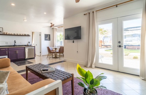 Gated Stylish desert home tastefully done with rich & bold colors and black accent walls. Located off a short beaten path yet close to town. Perfect place for an adventure in the desert or relaxing time. One bedroom, Two bath apartment with a brand new fully equipped kitchen. This unit is part of a three unit complex.