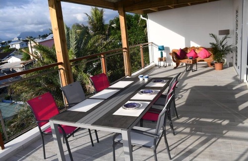 Accommodation of 120 m² upstairs with very large terrace (50 m²) with ocean and mountain views, for 4 to 6 people. Located in the Terre Sainte district, close to the sea (5 mins walk), restaurants and shops. A master bedroom with Queen Size bed and bathroom, a bedroom with 2 single beds, a sofa bed (160), an equipped kitchen, TV, wifi, a bathroom. Very comfortable accommodation, free secure parking, and swimming pool with sea views.