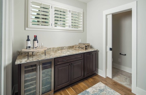 The fully stocked kitchen includes a Keurig and drip coffee maker, a gas range, and all utensils needed to prepare a delicious meal for the family. The open floorplan between the kitchen, dining area, and living room allows guests to spread out and relax. The living room includes a gas fireplace creating an inviting atmosphere. Adjacent to the living room is a dry bar including a wine cooler.