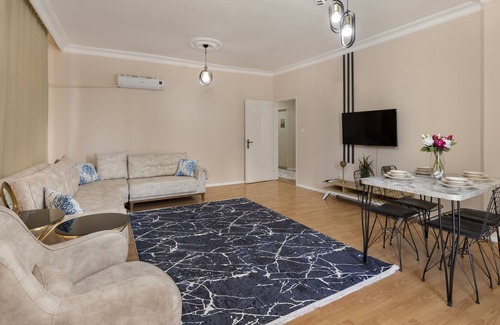 Cozy and beautifully decorated first-floor apartment with the most popular location in Antalya. In the bedroom, there is a double bed. In our spacious living room of 50 square meters you will see a large sofa that can be converted into bed. With the central kettle, hot water is always ready.