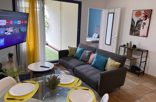 Charmant T2 avec vue, proche Université, Clinique, boulevard sud. Vous apprécierez sa vue sympathique (mer et montagne). Seule résidence autour de plusieurs villas dans une ruelle à sens unique. Endroit calme et bien entretenue.