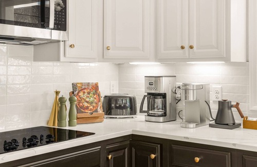 -Coffee & Tea... A variety of K-cup coffee as well as Starbucks drip coffee is provided. We also stock a variety of teas. There are coffee and tea options to serve a wide range of drink preferences including a Keurig Single Cup Brewer, a Cuisineart Drip Coffee Machine as well as a Bodum French Press. We also provide a beautiful Fellow Stagg Kettle.