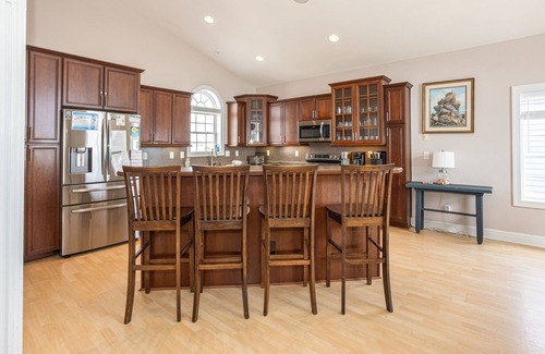 All three floors and every room overlook the ocean with the kitchen overlooking the bay. The first floor of the home features four bedrooms - only two bedrooms have en suite bathrooms; the third one is shared between the other two bedrooms. Enjoy an outdoor hot tub on the deck while looking at the ocean and overlooking the pool. There is also an enclosed outdoor shower with hot and cold water. On the second floor, you will find the main living space with a sunny open floor plan, a primary bedroom with an en suite bathroom, and a half bath. The lovely living area allows guests to unwind and admire the sparkling waters at the same time. The large TV offers endless entertainment during your stay. All the couches in the great room are brand new as well as the adjoining dining table that seats 10 people. The open kitchen is a chef's delight with all major appliances and utensils needed to whip up tasty full-course meals and beach snacks on the go. Coffee enthusiasts will be happy with two coffee makers, one of them a Keurig. The primary bedroom on this level features a private beachfront deck as well as an en suite bathroom with a jetted tub. The third floor hosts another primary bedroom with a TV, a beachfront deck, and an en suite with a jetted tub.