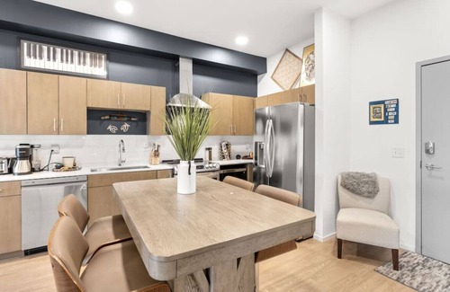 Beautifully designed with rich textures and music decor, the welcoming living area is the ultimate space to unwind. High 10-feet-high ceilings soar and large windows flood the open layout with natural light. Relax on the sleeper sofa or armchair and stream shows on the 55-inch Roku TV. The sleek kitchen features a full suite of stainless steel appliances. Handy extras include a blender, toaster, and coffee maker. Kick-start the day with morning coffee at the kitchen island for four.