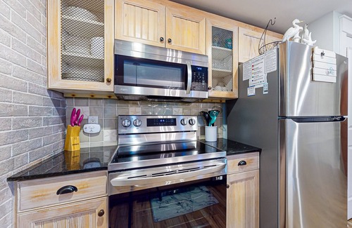 Inside this cheerful condo, you’ll find lots of light wood and nautical touches. The living room features a plush couch, flatscreen TV, and an electric fireplace for those “chilly” Florida nights. Fire up the electric grill on your balcony and eat al fresco as you watch the excitement of The Village of Baytowne Wharf just down the street. Or, head back inside to the dining area, which seats six. In the open galley-style kitchen you’ll find all the necessities for cooking up a full meal or just a snack for the beach, a short drive away. The main bedroom features an en suite bathroom, and both feature flatscreen TVs as well. If you’re looking for comfort and style as well as easy access to the best of the Emerald Coast, look no further.