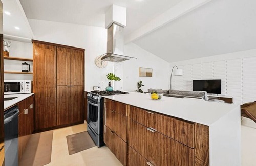The Guava door is a stylish, fully renovated mid-century modern home. The property features concrete floors, custom walnut cabinets, comfy furnishings, and beautiful natural light. There is a patio off of the dining room for outdoor dining and the backyard is very large and fully fenced.