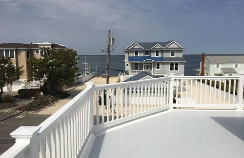 This BRAND NEW house has the perfect layout for large family vacations with plenty of indoor and outdoor living areas. Your summer vacation awaits you 3 short blocks to the beach and across the street from the bay. Rent this beautiful open, airy, house and you will make it your LBI summer home for years to come. Two indoor living rooms plus 2 wrap around decks (1 covered) and a roof top deck! 2 Bedrooms with king beds, 1 bed room with a queen, 1 bedroom with a twin bunk over full over twin trundle and another with 4 twin beds (2 bunk beds). House is large enough to fit 3 families comfortably and includes beach badges for 10 people (only required for kids over the age of 12). Also includes: 3 flat screen TVs, central A/C, grill, washer/dryer and beautiful complete kitchen for all of your needs. There are 2 garages with plenty of room for storage of bikes, beach supplies etc and an outside shower. This is a family neighborhood and we are looking to rent to families that respect our house and neighbors. Great location that is walking distance to local shops for browsing, Jersey Girl for bagels, coffee and sandwiches, Blue water café for lunch or dinner and Nardi’s. Easy, free shuttle ride to Fantasy Island shops and rides. Note, owner will be the only one with access to apt over the 3rd garage and may be onsite during the weekend to ensure smooth changeover. Please no pets and no smoking.