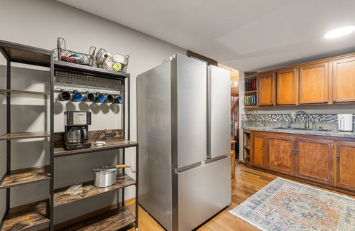 Inside, you'll find a charming woodstove, creating a perfect ambiance for sharing tales, and laughter, or indulging in one of the many books from the home's collection.