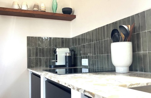 This 2-bedroom, 1-bathroom rental features a living room and air conditioning. Bathroom amenities include a hair dryer, towels, and toilet paper. The kitchen is equipped with an oven, a stovetop, and a refrigerator, as well as a coffee maker, an electric kettle, and a microwave.