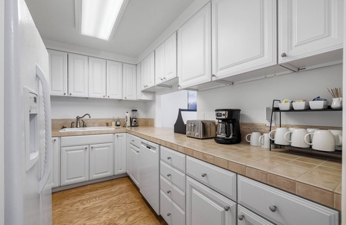 Our condo features three bedrooms, each with a comfortable bed to ensure a good night's sleep after a day of adventure. The master bedroom has a California king-size bed and an ensuite bathroom. The second bedroom has a queen-size bed, while the third bedroom has a set of bunk beds with one full and one twin, making it perfect for kids or young adults. The second bathroom is conveniently located in the hallway.