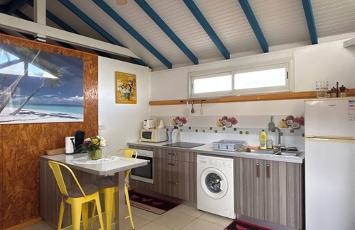 Large air conditioned F2 on the ground floor at the rear of a well fenced villa; Opening November 2016. Very calm residence. Lounge / kitchen area of 20m2; Bathroom and separate WC; Very comfortable room for 2 people with TV wall screen. A third person can stay in the living room equipped with a sofa. An umbrella cot available for baby. Habitable for 3 people maximum. Outdoor SPA protected by a covered and closed carbet, equipped with a swing. A covered outdoor shower adjacent to the spa.
