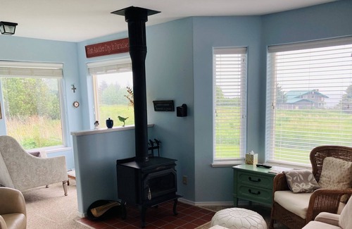 Enjoy the breathtaking views of the Kachemak Bay mountains, bay, and Homer spit while watching wild bunnies play in the yard. Bask in the sunshine on the deck outside with eagles and sandhill cranes flying overhead. Sit inside and take in the panoramic vista from one of the twelve windows facing the bay. Read a good book! Sip your coffee, tea, or wine! Relax in your house by the bay.
