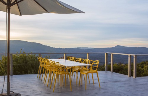 Cielo is a modern, private 10 acre estate overlooking the the magical Valley of the Moon section of Sonoma valley, miles of vineyards, and author Jack London's ranch. Come see the sunsets and the stars. Please note that a landslide in the area, originally expected to be cleared by July, is now scheduled for repair completion by the end of October. While the house is still fully accessible via Trinity Road, this detour adds approximately 15 minutes to the drive.