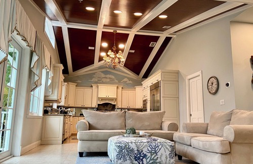 Enter the home from the front porch, which is next to the double carport which is in front of the 2 car garage with laundry. The huge great room has ample seating and an invitation to relax and unwind in paradise. It is complete with a modern and fully-stocked kitchen that overlooks a cozy living area with 2 couches and a smart TV for your viewing pleasure. Off the primary living area are two additional living areas. All 3 areas look out through french doors into the pool, garden, and roofed pavilion for your enjoyment. There is an inside dining table in the great room and a big 8 person teak table under the pavilion to enjoy the outside al fresco dining that is so common in the Keys. The home is equipped with Roku TV.