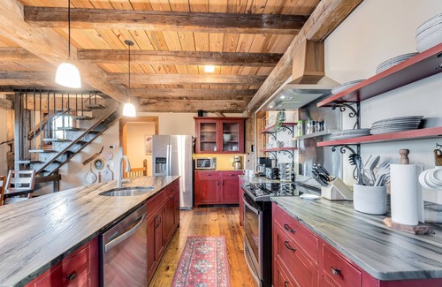 The second-floor loft bedroom has its own private bathroom and features a reclaimed cypress wood ceiling and hand-forged iron hardware. A loft door can open to the living room and allows enjoyment of the stone fireplace below.