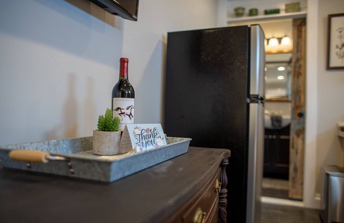 An old distressed door from our Miller House property has been mounted on a barn track and provides a nice addition and separates the main living area from the bathroom. In the bathroom are 2 shelves for your personal items and a small table. A clothes steamer, hair dryer as well as shampoo, conditioner and body wash are provided. We have installed a safety measure shower rain shower head so it does take a minute or two for the water to become hot.