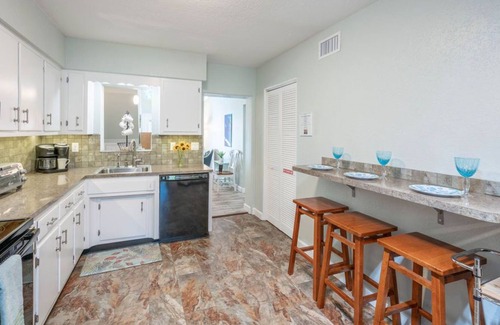 KITCHEN: Dishwasher, electric stove/oven, refrigerator, microwave, cooking basics, dishware & flatware, spices, breakfast bar w/ seating, coffee maker, toaster oven, blender, kettle, trash bags & paper towels