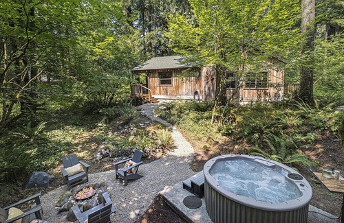 NEW! Wy'East Cabin! Time to relax at this peaceful woodland cedar cabin retreat! This 2 bd/2bth home also includes a 2-person sleeper sofa & bonus sleeping loft for 2. All you need for a relaxing get away in the woods. Wy’east cabin provides a unique experience that includes a private deck, hot tub & fire pit. River only steps away! Spend the day hiking or skiing the nearby slopes! In the evening you’ll be able to let your worries slip away, as you warm those soar muscles in a hot tub under the stars.