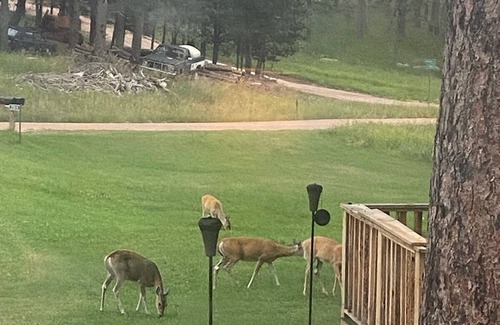 Love to see the deer wondering in the front yard. Close to Downton Custer-5 minutes to Crazy Horse,20 minutes to Mt.Rushmore, and 15 min. to Custer National Park. Nothin like quiet night around the firepit on the deck in front . There is FULL KITCHEN with all new appliances and outside grill where you can cook and enjoy your dinner around the firepit.(seasonal).Mobile home inside is fully remodeled .. 1 Master bedroom w/queen bed--bath attached---bathroom also has private entrance. 2nd bedroom queen bed and 3rd bedroom slide out day bed.. AC-heat-and TV with lots of DVD-bring your own if you like. Can sleep up to 6 ' wi-fi on property.This home has all new appliances including washer and dryer.60" tv in living room. The mobile also has small cabin(sleeps 2) on property for larger family if available..