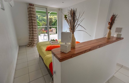 Beautiful T2, villa bottom to enjoy nature in the heart of a very green environment. The spacious terrace overlooks a private garden of 3000m2 in which you can discover the plants, flowers in Creole colors and picnic. Ideal to get away from stress and agitation. The benefits of nature on health are no longer to prove.