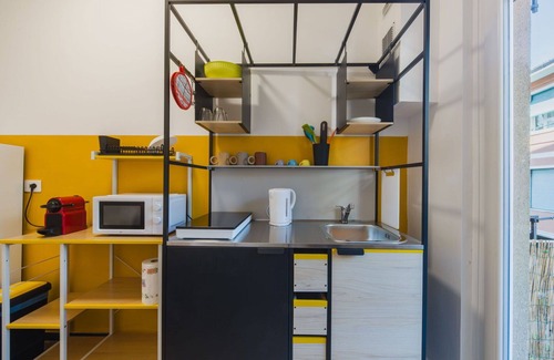 The apartment is equipped with a small kitchen, complete with 2 induction hot plates, a kettle, a microwave, and an electric coffee machine for your convenience. The bathroom has a shower, bidet, and toilet. Heating options include gas heating, air-conditioning, and forced-air heating for your comfort. The unit also comes with a washing machine and a hair dryer for your use.