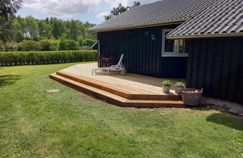 The cozy, bright living room has large windows facing the garden. The kitchen is open to the living room and has a dishwasher. There is also a washing machine. The house has 3 bedrooms - two double bedrooms and one twin bedroom. In addition, a loft with 2 beds. There are both crib and highchair available in the house. The bathroom is fitted with a shower, underfloor heating and a Spa bathtub.