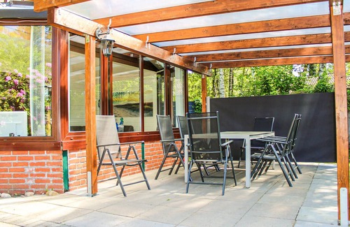 This inviting holiday home is located in a holiday home development on a beautiful plot in green surroundings and is ideal for a holiday with the whole family. Inside the house you will find a cosy and modern interior with many beautiful details. In the dining and living area, for example, there is a bar in the shape of a ship. Spend sociable evenings eating or playing games together here. The conservatory serves as a living room and offers a beautiful view of the garden.