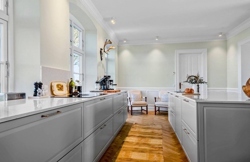 Enjoy a cosy break in this charming, lovingly restored holiday home. The rural tranquillity and sweeping views across the fields to the sea create a wonderful backdrop for relaxing days in the countryside. Look forward to a unique mix of historical charm and modern comfort in your holiday home. The high ceilings with exposed beams, the elegant wooden floors and the large windows create a bright and inviting atmosphere. Make yourself comfortable on the stylish sofas and enjoy the view of the greenery. The open-plan kitchen is equipped with modern appliances, while the adjoining dining area with its large wooden table invites you to enjoy convivial meals.