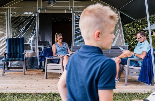 This nice, detached tent lodge is located on the lively Echternacherbrück campsite, on the edge of the South Eifel nature park on the river Süre/Sauer. The holiday park is located on the border of Germany and Luxembourg in the town of Echternacherbrück. You can walk via a bridge to the characterful centre of Echternach, the oldest town in Luxembourg, in about 5 minutes. The tent lodge is furnished in a comfortable, nice and complete way. Here, you will experience the real camping feeling, but with just a little more comfort. There is a living area with an open kitchen, including a fridge, freezer and a hob. There are three bedrooms, one of which has a double box spring bed, one with two single beds, which may be set up as a double bed, and one with a single bed. The tent lodge does not have a private bathroom. For the shower and toilet you use the central sanitary facilities at the campsite. Outside you will find a lovely covered terrace with garden furniture. There is parking for one car near the tent lodge. You can book various tent lodges for five people at the Echternacherbrück Campsite holiday park.