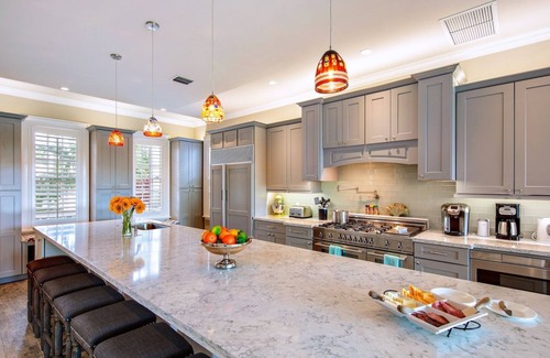 From the moment you step foot inside, you'll immediately know NOONA'S MANSION is special home. You'll be greeted by a breathtaking view straight through the home to the pool, a one-of-a-kind luxurious kitchen and a living area that is large enough for a family reunion. Gather around the 60 INCH flat screen SMART TV to watch the big game or take in your favorite show, using the well-appointed living room furniture. The 10-foot high scissor doors on the back of the home open up the living area to form a spacious pavilion. The kitchen is fully equipped and with state-of-the-art appliances, including a Bertazzoni Italia six-burner gas range and double oven. The kitchen island is extra-large, with plenty of countertop space for prepping home cooked meals and includes bar seating for up to eight. For more formal meals, there is also a full dining table next to the kitchen with seating for eight. A convenient powder room is located just off the living area.