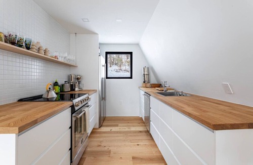 This sleek galley-style kitchen blends Nordic simplicity with modern function. Butcher block counters, open shelving, and stainless steel appliances make meal prep a pleasure—especially with calming forest views from the large picture window.